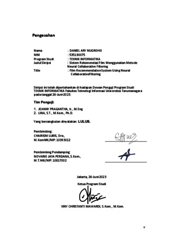 Nugroho, Daniel Ary (2023) Sistem rekomendasi film menggunakan metode neural collaborative filtering. Skripsi thesis, Universitas Tarumanagara.