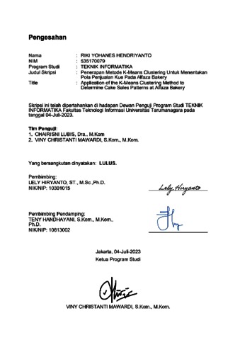 Hendriyanto, Riki Yohanes (2023) Penerapan metode k-means clustering untuk menentukan pola penjualan kue pada Alfaza Bakery. Skripsi thesis, Universitas Tarumanagara.