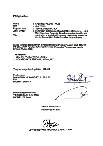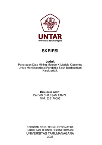 Tanzil, Calvin Chaesan (2023) Penerapan data mining metode k-medoid klastering untuk menklasterisasi penderita struk berdasarkan karakteristik. Skripsi thesis, Universitas Tarumanagara.