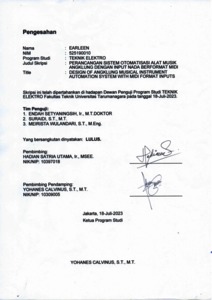 Earleen, Earleen (2023) Perancangan sistem otomatisasi alat musik angklung dengan input nada berformat midi. Skripsi thesis, Universitas Tarumanagara.