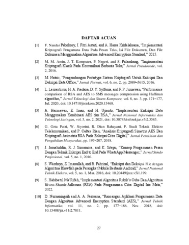 Suatu pesan chat memiliki privasi yang tinggi dan masih banyak aplikasi chat tidak menyediakan keamanan yang cukup memidai, sehingga pesan dapat disadap dan diketahui oleh orang yang tidak diinginkan. Kriptografi Advanced Encryption Standard (AES) umunya telah diterapkan pada kebanyakan aplikasi chat messenger, tetapi dengan masih maraknya kasus penyadapan dan penipuan maka diperlukannya suatu skema pengamanan yang dapat meningkatkan keamanan dan keaslian pada pesan. Perancangan ini bertujuan untuk menggabungkan skema kriptografi AES dan RSA dalam mengamankan pesan chat messenger berbasis Command Line Interface (CLI), sehingga dapat mengamankan pesan dari segi keamanan dan keaslian pesan teks. Perancangan ini menggunakan teks terdiri dari dari input karakter yang akan diberikan oleh kedua user yang akan melakukan chatting. Dari hasil pengujian dapat disimpulkan bahwa kriptografi AES dan RSA dinilai baik mengamankan pesan yang ada dikarenakan nilai dari enkripsi cipher key dari AES sendiri adalah sebesar 256 bit, sedangkan untuk enkripsi RSA sendiri sebesar 2048 bit. Selain itu, berdasarkan pengujian diperoleh waktu komputasi algoritma RSA adalah sebesar 15625 ms dengan menggunakan prosesor Intel Core i7-11800H, sedangkan metode enkripsi AES dengan rata-rata waktu yang dibutuhkan pada proses pengamanan menggunakan kriptografi AES adalah 6.71 ms dan 6.54 ms dengan menggunakan jenis prosesor Intel Core i7-11800H. Uji coba dilakukan dengan teknik enkripsi hybrid ini menggunakan sebuah random generator key, yang digunakan untuk menghasilkan sebuah key yang bersifat terenkripsi. Key yang akan digunakan pada seorang sender berupa AES dan pada saat, key tersebut dikirimkan kepada receiver, key tersebut akan didekripsi kan menjadi menggunakan metode RSA yang berupa plaintext. Pengamanan teknik enkripsi hybrid ini akan menyulitkan pihak ketiga untuk melakukan dekripsi pesan yang dikirimkan dari pihak sender kepada receiver. Kata kunci : Algoritma RSA, Advanced Encryption Standard, Chat Messenger