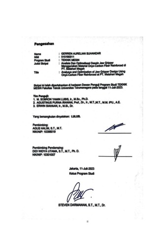 Suhandar, Gerren Aurelian (2023) Analisis dan optimalisasi desain jaw gripper menggunakan material onyx-carbon fiber reinforced di PT. Matahari megah (TM - 1331). Skripsi thesis, Universitas Tarumanagara.