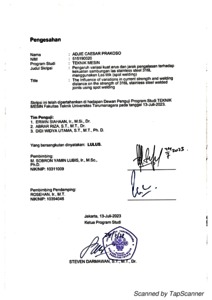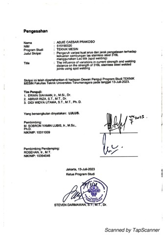 Prakoso, Adjie Caesar (2023) Pengaruh variasi kuat arus dan jarak pengelasan terhadap kekuatan sambungan las stainless steel 316l menggunakan las titik (spot welding) (TM - 1337). Skripsi thesis, Universitas Tarumanagara.