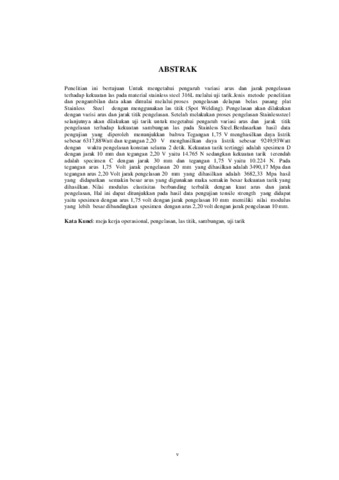 Penelitian ini bertujuan Untuk mengetahui pengaruh variasi arus dan jarak pengelasan terhadap kekuatan las pada material stainless steel 316L melalui uji tarik.Jenis metode penelitian dan pengambilan data akan dimulai melalui proses pengelasan delapan belas pasang plat Stainless Steel dengan menggunakan las titik (Spot Welding). Pengelasan akan dilakukan dengan varisi arus dan jarak titik pengelasan. Setelah melakukan proses pengelasan Stainlesssteel selanjutnya akan dilakukan uji tarik untuk megetahui pengaruh variasi arus dan jarak titik pengelasan terhadap kekuatan sambungan las pada Stainless Steel.Berdasarkan hasil data pengujian yang diperoleh menunjukkan bahwa Tegangan 1,75 V menghasilkan daya listrik sebesar 6317,88Watt dan tegangan 2,20 V menghasilkan daya listrik sebesar 9249,93Watt dengan waktu pengelasan konstan selama 2 detik. Kekuatan tarik tertinggi adalah spesimen D dengan jarak 10 mm dan tegangan 2,20 V yaitu 14.765 N sedangkan kekuatan tarik terendah adalah specimen C dengan jarak 30 mm dan tegangan 1,75 V yaitu 10.224 N. Pada tegangan arus 1,75 Volt jarak pengelasan 20 mm yang dihasilkan adalah 3490,17 Mpa dan tegangan arus 2,20 Volt jarak pengelasan 20 mm yang dihasilkan adalah 3682,33 Mpa hasil yang didapatkan semakin besar arus yang digunakan maka semakin besar kekuatan tarik yang dihasilkan. Nilai modulus elastisitas berbanding terbalik dengan kuat arus dan jarak pengelasan, Hal ini dapat ditunjukkan pada hasil data pengujian tensile strength yang didapat yaitu spesimen dengan arus 1,75 volt dengan jarak pengelasan 10 mm memiliki nilai modulus yang lebih besar dibandingkan spesimen dengan arus 2,20 volt dengan jarak pengelasan 10 mm. Kata Kunci: meja kerja operasional, pengelasan, las titik, sambungan, uji tarik
