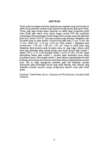 Turbin pelton merupakan suatu alat yang bekerja mengubah energi kinetik pada air akibat energi potensial menjadi energi mekanik berupa putaran pada poros turbin. Tujuan yang ingin dicapai dalam penelitian ini adalah dapat mengetahui profil aliran fluida pada sistem turbin pelton dengan metode CFD dan melakukan perbandingan hasil perhitungan teoritis dengan hasil simulasi yang telah dilakukan pada Ansys Student 2023 R1. Dari hasil simulasi yang dilakukan, didapatkan nilai kecepatan aliran air pada variabel 1 berturut-turut pada nosel 15 mm, 14 mm, dan 13 mm: 18,864 m/s; 21,29 m/s; 24,59 m/s. Pada variabel 2 didapatkan hasil berturut-turut: 7,738 m/s; 7,709 m/s; 7,701 m/s. Selain itu profil aliran yang didapatkan tidak konsisten pada kecepatan aliran air yang tinggi. Namun untuk daya yang dihasilkan pada masing-masing nosel secara berurut pada variabel 1 adalah: 1,97%; 1,57%; 1,18% dan pada variabel 2: 81,9%; 95,18%; 110,50%. Dapat disimpulkan bahwa pada variabel 1, simulasi dapat dinyatakan benar dalam pernyataan Sarjono. Namun pada variabel 2, hasil efisiensi yang dihasilkan bertolak belakang yaitu semakin kecil diameter nosel hasil efisiensi yang dihasilkan semakin besar. Hal ini dapat dipengaruhi kesalahan pada saat dilakukan simulasi dikarenakan pada perhitungan teoritis yang sudah dihitung, hasil efisiensi yang dihasilkan semakin menurun seiring mengecilnya diameter nosel pada turbin pelton. Kata kunci: Turbin Pelton, Nozzle, Computational Fluid Dynamics, Simulasi, Profil Aliran Air