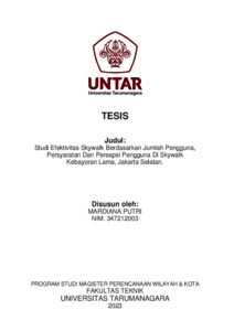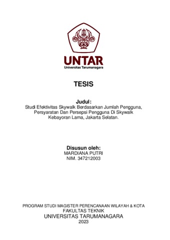 Putri, Mardiana (2023) Studi efektivitas skywalk berdasarkan jumlah pengguna, persyaratan dan persepsi pengguna di Skywalk Kebayoran Lama, Jakarta Selatan. Masters thesis, Universitas Tarumanagara.