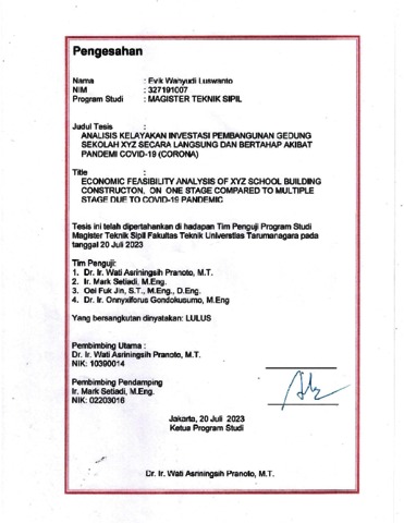 Luswanto, Evik Wahyudi (2023) Analisis kelayakan investasi pembangunan gedung sekolah xyz secara langsung dan bertahap akibat pandemi covid-19 (corona). Masters thesis, Universitas Tarumanagara.