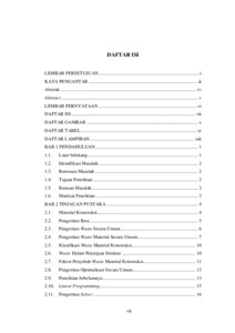 Material besi memiliki peran penting pada saat pembangunan konstruksi. Pada proses pembangunan konstruksi, tidak dapat dihindari munculnya waste besi yang dapat menyebabkan pengeluaran biaya yang sia-sia. Salah satu penyebab terjadinya waste besi yang sering terjadi yaitu pemotongan besi di lapangan yang tidak optimal, sehingga diperlukan solusi agar dapat mengurangi waste besi. Metode Linear Programming merupakan salah satu solusi untuk mengurangi waste besi. Penelitian ini bertujuan agar dapat mengetahui perbedaan sisa pemotongan besi di lapangan dengan sisa pemotongan besi setelah menggunakan Metode Linear Programming. Salah satu cara menghasilkan nilai waste besi dari model Linear Programming yaitu dengan menggunakan program Solver. Penelitian ini dilakukan pada proyek rumah tinggal di Manado. Pada penelitian ini, digunakan dua tanda yaitu ≥ dan = untuk membatasi fungsi tujuan. Penggunaan tanda ≥ menghasilkan kebutuhan besi yang lebih besar dari lapangan, namun menghasilkan waste besi yang terkecil. Sedangkan penggunaan tanda = menghasilkan kebutuhan besi yang terkecil, namun menghasilkan waste besi yang lebih besar dari tanda ≥. Penelitian ini juga digunakan dua cara untuk menghasilkan persentase penghematan dengan mengerjakan berdasarkan masing-masing diameter pada tiap pekerjaan dan mengerjakan berdasarkan diameter yang digabungkan dari pekerjaan sloof, balok, dan kolom. Pada pengerjaan berdasarkan diameter tiap pekerjaan dihasilkan penghematan sebesar 9% dan untuk pengerjaan berdasarkan diameter yang digabungkan dihasilkan penghematan sebesar 9,1%. Kata kunci: Waste besi, Linear Programming, program Solver, besi tulangan