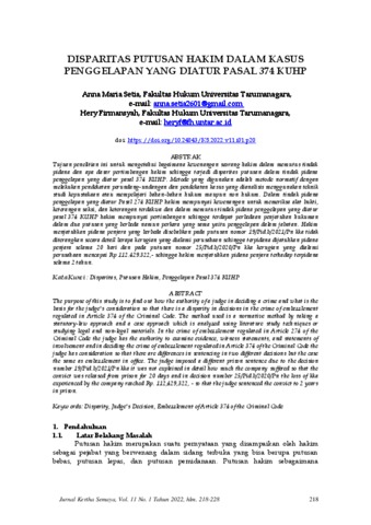 Setia, Anna Maria and Firmansyah, Hery Disparitas Putusan Hakim Dalam Kasus Penggelapan Yang Diatur Pasal 374 KUHP. Jurnal Kertha Semaya, 11 (1). ISSN 2303-0569