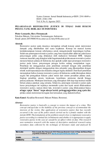 Leonardo, Pieter (2023) Pelaksanaan Restorative Justice Di Tinjau Dari Hukum Pidana Yang Berlaku Di Indonesia. Syntax Literate: Jurnal Ilmiah Indonesia, 8 (8). ISSN p–ISSN: 2541-0849; e-ISSN: 2548-1398