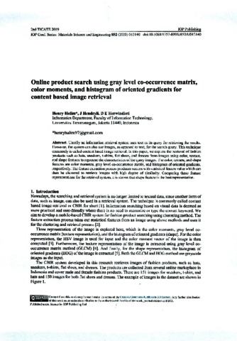 Henry Halim, Pertama and J Hendryli, Kedua and D E Herwindiati, Ketiga Online product search using gray level co- occurrence matrix, color moments, and histogram of oriented gradients for content based image retrieval. Online product search using gray level co- occurrence matrix, color moments, and histogram of oriented gradients for content based image retrieval.