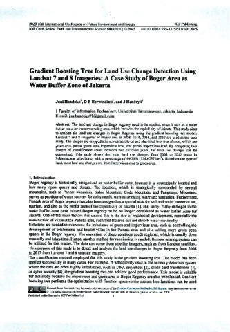 Juni Handoko, Pertama and D E Herwindiati, Kedua and J Hendryli, Ketuga Gradient Boosting Tree for Land Use Change Detection Using Landsat 7 and 8 Imageries: A Case Study of Bogor Area as Water Buffer Zone of Jakarta. Gradient Boosting Tree for Land Use Change Detection Using Landsat 7 and 8 Imageries: A Case Study of Bogor Area as Water Buffer Zone of Jakarta.