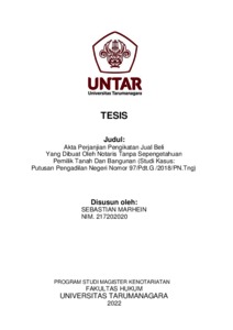 Marhein, Sebastian (2022) Akta Perjanjian Pengikatan Jual Beli Yang Dibuat Oleh Notaris Tanpa Sepengetahuan Pemilik Tanah Dan Bangunan (Studi Kasus: Putusan Pengadilan Negeri Nomor 97/Pdt.G /2018/PN.Tng). Masters thesis, Universitas Tarumanagara.