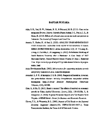Chandra, Carlos (2023) Perancangan kelayakan proyek pembangunan infrastruktur jalan tol soraja terhadap pertumbuhan lapangan pekerjaan setempat. Skripsi thesis, Universitas Tarumanagara.