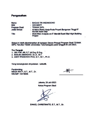 Wizaksono, Bagus Tri (2023) Analisis risiko kerja pada proyek bangunan tinggi IT mandiri bumi Slipi. Skripsi thesis, Universitas Tarumanagara.