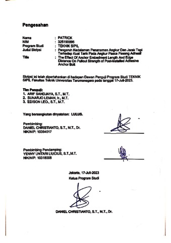 Patrick, Patrick (2023) Pengaruh kedalaman penanaman angkur dan jarak tepi terhadap kuat tarik pada angkur pasca pasang adhesif. Skripsi thesis, Universitas Tarumanagara.