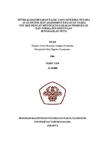 Yani, Vedry (2020) Optimalisasi Besaran Pajak Yang Diterima Negara Atas Sistem Self Assessment Kegiatan Usaha Notaris Dengan Meneyelenggarakan Pembukuan Dan Norma Penghitungan Penghasilan Neto. Masters thesis, Universitas Tarumanagara.
