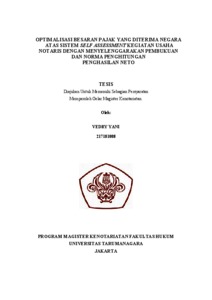 Tesis ini membahas mengenai Optimalisasi besaran pajak yang di terima Negara atas system Self Assessment Kegiatan Usaha Notaris, yang mana pada tesis ini peneliti akan melakukan wawancara dengan salah satu narasumber yang menjadi subjek untuk di ambil datanya sebagai sampel yang akan di lakukan perbandingan dalam bentuk penyampaian dengan menggunakan metode pembukuan dan Norma Penghitungan Penghasilan Neto. Dengan asas-asas perpajakan, yaitu asas keadilan dan asas kesederhanaan. Serta mencari tahu besarnya pajak yang terhutang bagi Notaris apabila menggunakan Norma Penghitungan Penghasilan Neto dan apabila menyelenggarakan Pembukuan. Penelitian ini merupakan penelitian kuantitatif dengan terapan deskriptif. Hasil temuan dari penelitian ini adalah asas keadilan dan asas kesederhanaan yang mana akan timbul suatu pro dan kontra tergantung sudut pandang pihak-pihak yang melaksanakan kewajiban perpajakannya. Temuan penelitian ini juga untuk mengetahui Optimalnya penerimaan negara berdasarkan hasil dari besarnya pajak terhutang yang didapat dari hasil simulasi perhitungan dengan menyelenggarakan Pembukuan dan Norma Penghitungan Penghasilan Neto berdasarkan hasil data yang diperoleh dari narasumber yang memiliki kegiatan usaha notaris. Temuan penelitian juga menyarankan agar terus dilakukannya perbaikan atas ketentuan peraturan mengenai system perpajakan agar setiap wajib pajak memiliki kemudahan dalam menyampaikan kewajiban perpajakannya.
