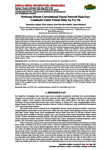 Dameethia Angeline, Pertama and Erico Jochsen, Kedua and Dyah Erny Herwindiati, Ketiga and Janso, Keempat Performa Metode Convolutional Neural Network Pada Face Landmark Untuk Virtual Make Up Try On. Performa Metode Convolutional Neural Network Pada Face Landmark Untuk Virtual Make Up Try On.