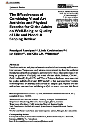 Roswiyani, Pertama The effectiveness of combining visual art activities and physical exercise for older adults on well-being or quality of life and mood: a scoping review. The effectiveness of combining visual art activities and physical exercise for older adults on well-being or quality of life and mood: a scoping review.