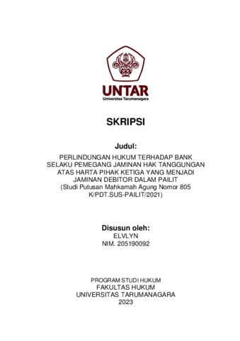 Elvlyn, Elvlyn (2023) Perlindungan Hukum Terhadap Bank Selaku Pemegang Jaminan Hak Tanggungan Atas Harta Pihak Ketiga Yang Menjadi Jaminan Debitor Dalam Pailit (Studi Putusan Mahkamah Agung Nomor 805 K/PDT.SUS-PAILIT/2021). Skripsi thesis, Universitas Tarumanagara.