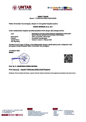 PENGARUH FAKTOR KARAKTERISTIK DEMOGRAFI TERHADAP BIAYA PROYEK INFRASTUKTUR DESA TERTINGGAL.pdf Download (1MB) | Preview |