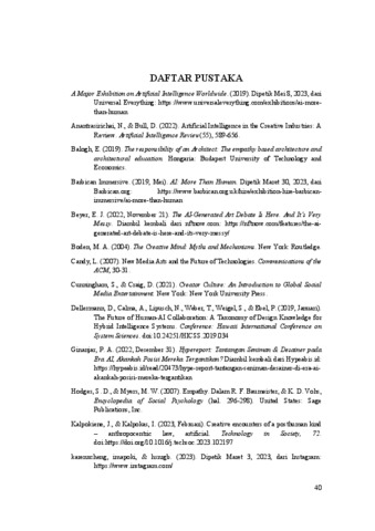Perkembangan teknologi Artificial Intelligence (AI) generatif telah membuka banyak diskursus di kalangan pelaku industri kreatif dunia salah satunya komunitas kreator digital Indonesia. Mesin AI ini menghasilkan karya kreatif yang dapat dikatakan setara dengan kemampuan manusia. Dalam industri kreatif AI telah menjadi alat digital yang mendukung kreativitas manusia dan menciptakan keterlibatan kreatif untuk memnuhi kebutuhan kreativitas orisinil. Integrasi AI ke dalam proses kreatif mempengaruhi cara kreator membuat konten kreatif yang lebih inovatif serta kompleks, bahkan mendorong batas kreativitas mereka sendiri dan menciptakan karya yang dulunya tidak terbayangkan. Namun, beberapa Upaya pengenalan integrasi AI dan manusia sampai saat ini masih berfokus di museum ataupun pameran sebagai lokasi edukasi AI. Ekspresi kreatif antara manusia dan AI akan membutuhkan ruang gerak kreatif yang dapat memfasilitasi individu untuk mengevaluasi secara kritis teknologi AI; berkomunikasi dan berkolaborasi secara efektif dengan AI. Maka tujuan dari artikel ini adalah membahas bagaimana tren kolaborasi manusia dan AI telah membawa perubahan signifikan dalam desain studio kreatif. Metode penelitian menggunakan observasi dan studi kasus terhadap beberapa akun konten kreator ternama yang terverifikasi sebagai akun official di Instagram dan menggunakan AI sebagai media pembuatan konten, serta kepustakaan. Interaksi manusia dan AI dalam desain ruang reatif mencakup elemen-elemen penting seperti media imersif, keterlibatan audiens, dan pengalaman langsung. Desain studio kreatif AI yang menyesuaikan pengalaman dan aktivitas audiens menggunakan AI memberikan kesempatan bagi para kreator untuk menjelajahi potensi baru dalam ekspresi kreatif mereka. Maka, melalui interaksi manusia dan AI, ruang kreatif dapat menjadi inovatif, mendalam, dan lebih dinamis, dimana manusia dan AI saling melengkapi dan berkolaborasi Kata kunci: Artificial Intelligence; desain; interaksi manusia; ruang kreatif;