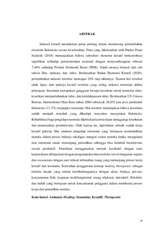 Industri kreatif memainkan peran penting dalam mendorong pertumbuhan ekonomi Indonesia secara keseluruhan. Data yang dikeluarkan oleh Badan Pusat Statistik (2018) menunjukkan bahwa subsektor ekonomi kreatif berkontribusi signifikan terhadap perekonomian nasional dengan menyumbangkan sebesar 7,44% terhadap Produk Domestik Bruto (PDB). Salah satunya berasal dari sub sektor film, animasi, dan video. Berdasarkan Badan Ekonomi Kreatif (2020), pertumbuhan industri tersebut mencapai 10% tiap tahunnya. Namun hal tersebut tidak lepas dari pekerja kreatif tersebut yang sering terkena insomnia akibat pekerjaan. Insomnia merupakan gangguan berupa kesulitan untuk memulai tidur, kesulitan mempertahankan tidur, dan ketidakpuasan tidur. Berdasarkan US Census Bureau, International Data Base tahun 2004 sebanyak 28,035 juta jiwa penduduk Indonesia (11,7%) terjangkit insomnia. Hal tersebut menunjukan bahwa insomnia sudah menjadi masalah yang dihadapi mayoritas masyarakat Indonesia. Rehabilitasi bagi pengidap insomnia diperlukan karena dapat menggangu kesehatan dan menurunkan produktivitas. Oleh karena itu, diperlukan sebuah wadah kerja kreatif pekerja film animasi pengidap insomnia yang bertujuan memudahkan mereka dalam proses bekerja sekaligus mengisi waktu mereka ketika mengalami fase insomnia untuk menunjang pemulihan sehingga bisa kembali beraktivitas secara produktif. Penelitian menggunakan metode kualitatif dengan riset kepustakaan dilanjutkan dengan pengumpulan data melalui survei bangunan sejenis dan wawancara dengan user terkait kebutuhan ruang yang menunjang proses kerja kreatif dan insomnia. Kemudian penggunaan konsep healing therapeutic sebagai kriteria desain yang terkait keterhubungannya dengan alam, budaya, privasi, kenyamanan fisik, kegiatan multifungsional, ruang relaksasi, interaktif, fleksibel, dan indah yang bertujuan untuk kenyamanan pengguna dalam membantu proses