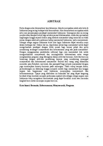 Rutin dengan aksi demonstrasi tiap tahunnya, Jakarta merupakan salah satu kota di Indonesia yang sering terdapat aksi demonstrasi. Aksi demonstrasi merupakan salah satu cara penyampaian pendapat masyarakat Indonesia. Sayangnya aksi ini sering memberikan dampak buruk bagi sekitarnya saat dilaksanakan, mulai dari perusakan lingkungan hingga sejarah kelam yang ditakuti masyarakat yang mana hal ini tidak sesuai dengan salah satu pedoman hidup masyarakat Indonesia, yaitu musyawarah. Sebagai warga negara Indonesia tentu kita ingin Indonesia dapat semakin maju dalam berbagai hal. Dalam hal ini, diperlukan solusi bagi masyarakat untuk dapat mengeluarkan pendapat dengan lebih ramah bagi semua pihak dan perlu mendorong semangat musyawarah dan kebersamaan yang ada pada masyarakat. Dengan menggunakan pendekatan informal bagi cara masyarakat kita untuk mengembalikan musyawarah dan meningkatkan kebersamaan antar warga menghasilkan program yang dibungkus dalam aktivitas bermain. Aktivitas baru ini terancang dengan aktivitas pendukung lainnya yang mendorong semangat musyawarah dan kebersamaan masyarakat. Bentuk dari ruang yang dihasilkan memiliki poin fleksibel, universal, dan parsipatif bagi seluruh masyarakat dengan juga menerapkan konsep bermain pada rancangan. Tidak cukup sampai disini, perkembangan ini didorong hingga menjadi contoh bagi masyarakat lain hingga negara lain bagaimana cara Indonesia menerapkan musyawarah dan kebersamaannya. Upaya yang dilakukan ini bukanlah hal yang dapat langsung berubah tetapi kembali menjadi pertanyaan apakah kita sebagai warga negara mau Indonesia tetap mengalami demonstrasi yang dapat berakhir ricuh atau memulai langkah baru untuk mencapai impian baru ini. Kata kunci: Bermain; Kebersamaan; Musyawarah; Program
