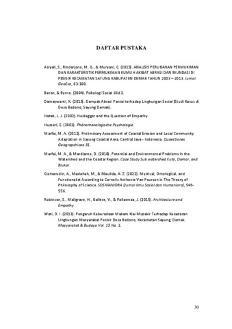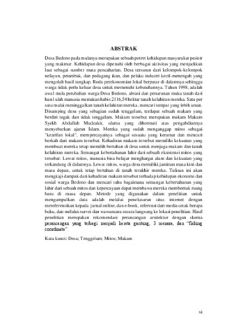 Desa Bedono pada mulanya merupakan sebuah potret kehidupan masyarakat pesisir yang makmur. Kehidupan desa dipenuhi oleh berbagai aktivitas yang menjadikan laut sebagai sumber mata pencaharian. Desa tersusun dari kelompok-kelompok nelayan, petambak, dan pedagang ikan, dan pelaku industri kecil-menengah yang mengolah hasil tangkap. Roda perekonomian lokal berputar di dalamnya sehingga warga tidak perlu keluar desa untuk memenuhi kebutuhannya. Tahun 1998, adalah awal mula perubahan warga Desa Bedono, abrasi dan penurunan muka tanah dari hasil ulah manusia memakan habis 2116,54 hektar tanah kelahiran mereka. Satu per satu mulai meninggalkan tanah kelahiran mereka, mencari tempat yang lebih aman. Disamping desa yang sebagian sudah tenggelam, terdapat sebuah makam yang berdiri tegak dan tidak tenggelam. Makam tersebut merupakan makam Makam Syekh Abdullah Mudzakir, ulama yang dihormati atas pengabdiannya menyebarkan ajaran Islam. Mereka yang sudah menganggap mitos sebagai "kearifan lokal", mempercayainya sebagai sesuatu yang keramat dan mencari berkah dari makam tersebut. Kehadiran makam tersebut memiliki kekuatan yang membuat mereka tetap memilih bertahan di desa untuk menjaga makam dan tanah kelahiran mereka. Semangat kebertahanan lahir dari sebuah eksistensi mitos yang tersebar. Lewat mitos, manusia bisa belajar menghargai alam dan kekuatan yang terkandung di dalamnya. Lewat mitos, warga desa memiliki jaminan masa kini dan masa depan, untuk tetap bertahan di tanah terakhir mereka. Tulisan ini akan mengkaji dampak dari kehadiran makam tersebut terhadap kehidupan ekonomi dan sosial warga Bedono dan mencari tahu bagaimana semangat kebertahanan yang lahir dari sebuah mitos dan kepercayaan dapat membawa mereka membentuk ruang baru di masa depan. Metode yang digunakan dalam penelitian untuk mengumpulkan data adalah melalui penelusuran situs internet dengan mereferensikan kepada jurnal online, dan e-book, referensi dari media cetak berupa buku, dan melalui survei dan wawancara secara langsung ke lokasi penelitian. Hasil penelitian merupakan rekomendasi perancangan arsitektur dengan skema perancangan yang terbagi menjadi kereta gantung, 3 menara, dan “fishing coordinate”. Kata kunci: Desa; Tenggelam; Mitos; Makam