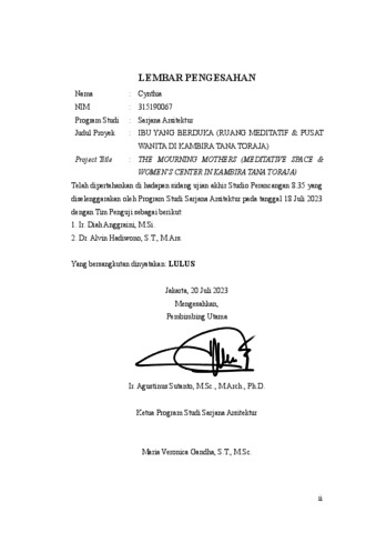 Cynthia, Cynthia (2023) Ibu yang berduka (ruang meditatif & pusat wanita di Kambira Tana Toraja). Skripsi thesis, Universitas Tarumanagara.