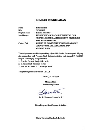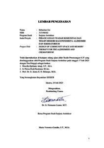 Joe, Sebastian (2023) Perancangan wadah komunitas dan terapi memori bagi penderita alzheimer dan krematorium. Skripsi thesis, Universitas Tarumanagara.