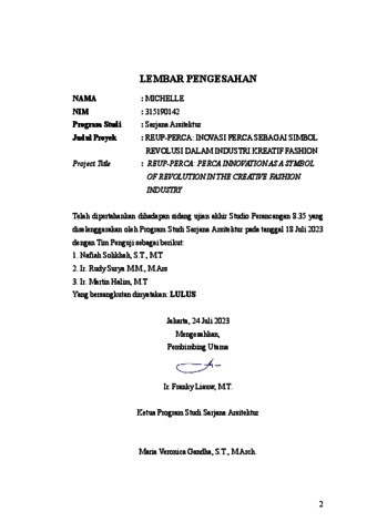 Michelle, Michelle (2023) Reup-perca: inovasi perca sebagai simbol revolusi dalam industri kreatif fashion. Skripsi thesis, Universitas Tarumanagara.