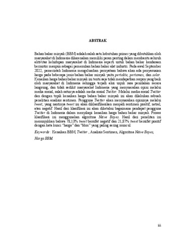 Bahan bakar minyak (BBM) adalah salah satu kebutuhan primer yang dibutuhkan oleh masyarakat di Indonesia dikarenakan memiliki peran penting dalam membantu seluruh aktivitas kehidupan masyarakat di Indonesia seperti untuk bahan bakar kendaraan bermotor maupun sebagai pemenuhan bahan bakar alat industri. Pada awal September 2022, pemerintah Indonesia mengeluarkan pernyataan bahwa akan ada penyesuaian harga pada beberapa jenis bahan bakar minyak yaitu pertalite, pertamax, dan solar. Kenaikan harga bahan bakar minyak ini tentu saja tidak mendapatkan respon yang baik oleh masyarakat di Indonesia sehingga terjadi aksi unjuk rasa penolakan secara langsung, dan tidak sedikit masyarakat Indonesia yang menyuarakan opini melalui media sosial, salah satunya adalah media sosial Twitter. Melalui media sosial Twitter dan dengan topik kenaikan harga bahan bakar minyak ini akan dilakukan sebuah penelitian analisis sentimen. Pengguna Twitter akan menyuarakan opininya melalui tweet, yang nantinya tweet ini akan diklasifikasikan menjadi sentimen positif, netral, atau negatif. Hasil dari klasifikasi ini akan diketahui bagaimana pendapat pengguna Twitter di Indonesia dalam menyikapi kenaikan harga bahan bakar minyak. Proses klasifikasi ini menggunakan algoritma Naïve Bayes. Hasil dari penelitan ini menunjukkan bahwa 78,13% tweet bersifat negatif dan 21,87% tweet bersifat positif dengan kata kunci “harga” dan “bbm” yang paling sering muncul. Keywords : Kenaikan BBM, Twitter , Analisis Sentimen, Algoritma Naïve Bayes, Harga BBM.