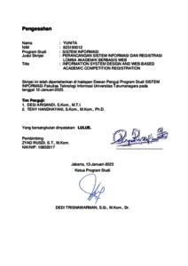 Yunita, Yunita (2023) Perancangan sistem informasi dan registrasi lomba akademik berbasis web. Skripsi thesis, Universitas Tarumanagara.