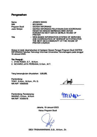 Wang, Jensen (2023) Sistem informasi pelayanan dan koordinasi kegiatan ibadah berbasis web untuk komunitas next gen di gereja house of prayer. Skripsi thesis, Universitas Tarumanagara.