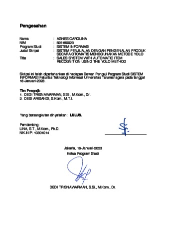 Carolina, Agnes (2023) Sistem penjualan dengan pengenalan produk secara otomatis menggunakan metode yolo. Skripsi thesis, Universitas Tarumanagara.