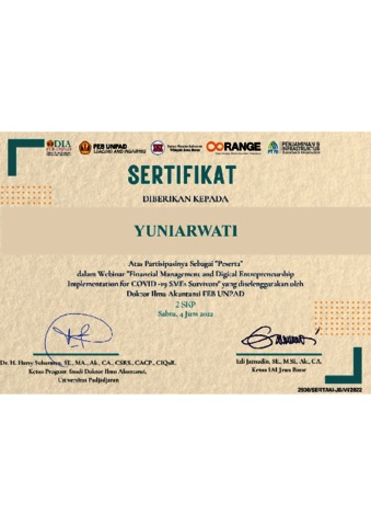 Yuniarwati, Yuniarwati (2022) Financial Management and Digital Entrepreneurship Implementation for COVID-19 SMEs Survivors 2022 SKP. Financial Management and Digital Entrepreneurship Implementation for COVID-19 SMEs Survivors 2022 SKP.