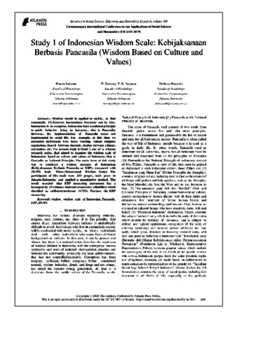 Riana Sahrani, Pertama and P Tommy Y S Suyasa, Kedua and Debora Basaria, Ketiga Study 1 of Indonesian Wisdom Scale: Kebijaksanaan Berbasis Pancasila (Wisdom Based on Culture and Values). Study 1 of Indonesian Wisdom Scale: Kebijaksanaan Berbasis Pancasila (Wisdom Based on Culture and Values).