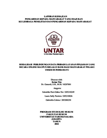Gunardi, Gunardi and Salsabila, Putri Zahra Nst and Patricia, Laura Sally and Calista, Gabriella Sosialisasi Perlindungan Data Pribadi Layanan Pinjaman Uang Secara Online Maupun Melalui Bank Bagi Masyarakat Pelaku UMKM Di Indramayu. Laporan Kemajuan Pengabdian Kepada Masyarakat.