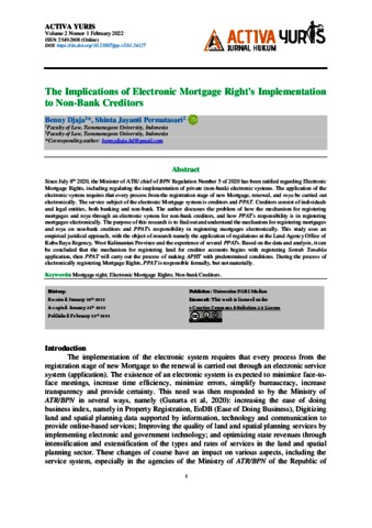 Djaja, Benny and Permatasari, Shinta Jayanti (2022) The Implications of Electronic Mortgage Right's Implementation to Non-Bank Creditors. ACTIVA YURIS, 2 (1).