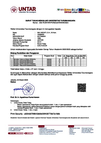 Hadiati, Mia Surat Tugas Mengajar Universitas Tarumanagara. Universitas Tarumanagara.