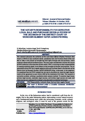 Rahaditya, R and Hutagalung, Lorraine Anggi Taruli (2023) THE NOTARY'S RESPONSIBILITY FOR DEFECTIVE LEGAL SALE AND PURCHASE DEEDS (A REVIEW OF THE DECISION OF THE DISTRICT COURT OF WONOGIRI NUMBER 13/PDT.G/2021/PN WNG). Eduvest – Journal of Universal Studies, 3 (10). ISSN 2775-3727