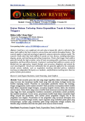 Arifin, Melissa and Djaja, Benny (2023) Kajian Hukum Terhadap Status Kepemilikan Tanah di Sulawesi Tenggara. Unes Law Review, 6 (2).