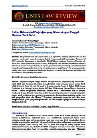 Nathanael, Moses (2023) Akibat Hukum dari Perjanjian yang Dibuat dengan Tanggal Mundur (Back Date). Unes Law Review, 6 (1).