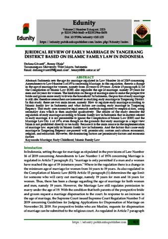 Givanti, Dofana (2023) JURIDICAL REVIEW OF EARLY MARRIAGE IN TANGERANG DISTRICT BASED ON ISLAMIC FAMILY LAW IN INDONESIA. Edunity, 2 (8).