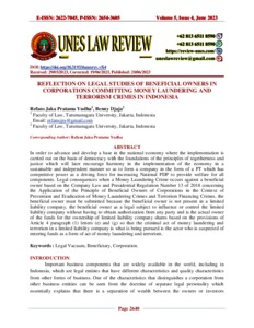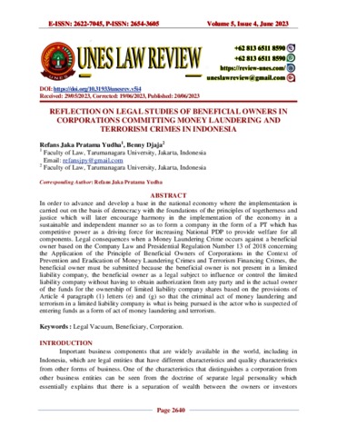 Yudha, Refans Jaka Pratama and Djaja, Benny (2023) Reflection On Legal Studies Of Beneficial Owners In Corporations Committing Money Laundering And Terrorism Crimes In Indonesia. Unes Law Review, 5 (4).