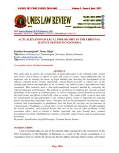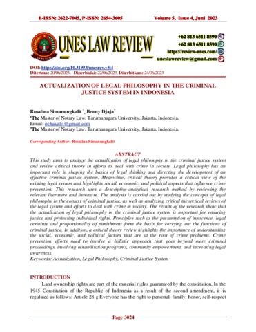 Simanungkalit, Rosalina and Djaja, Benny (2023) Actualization Of Legal Philosophy In The Criminal Justice System In Indonesia. Unes Law Review, 5 (4).