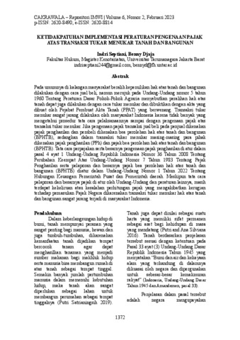 Septiani, Indri and Djaja, Benny (2023) Ketidakpatuhan Implementasi Peraturan Pengenaan Pajak Atas Transaksi Tukar Menukar Tanah Dan Bangunan. Cakrawala, 6 (2).