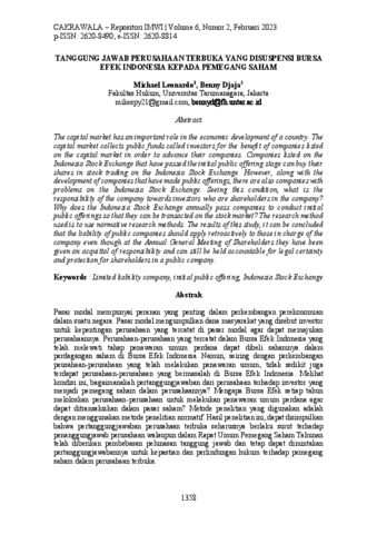 Leonardo, Michael and Djaja, Benny (2023) Tanggung Jawab Perusahaan Terbuka Yang Disuspensi Bursa Efek Indonesia Kepada Pemegang Saham. Cakrawala, 6 (2).